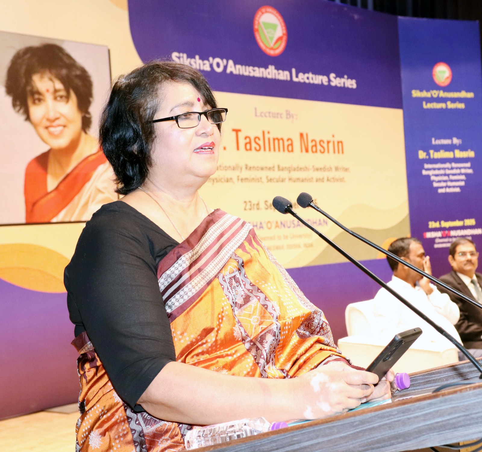 ସେ ନିଜ ବକ୍ତବ୍ୟରେ କହିଥିଲେ ଯେ “ବାଂଲାଦେଶ ମୋତେ ନିର୍ବାସିତ କଲା, ପଶ୍ଚିମବଂଗ ଯେଉଁଠାରେ ମୁଁ ରହୁଥିଲି ସେଠାରୁ ବି ମୁଁ ନିର୍ବାସିତ ହେଲି। ମୋର କୌଣସି ଘର ନାହିଁ, ମୋର କୌଣସି ଦେଶ ବି ନାହିଁ। ମୁଁ ଅଭିବ୍ୟକ୍ତିର ସ୍ୱତନ୍ତ୍ରତାରେ ବିଶ୍ୱାସ କରେ ଏବଂ ମହିଳାମାନେ ଧାର୍ମିକ ଅତ୍ୟାଚାରକୁ ପ୍ରତିରୋଧ କରିବା ଉଚିତ୍ ବୋଲି ମୁଁ ମନେ କରେ ବୋଲି ଡକ୍ଟର ନସରିନ୍ ଭରପୂର ଅଡିଟୋରିୟମରେ କହିଛନ୍ତି।