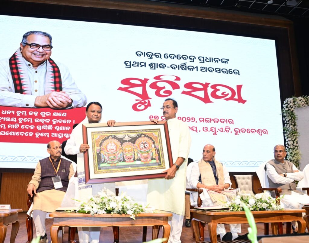 ମଙ୍ଗଳବାର ପୂର୍ବତନ କେନ୍ଦ୍ରମନ୍ତ୍ରୀ ସ୍ୱର୍ଗତ ଡାକ୍ତର ଦେବେନ୍ଦ୍ର ପ୍ରଧାନଙ୍କ ପ୍ରଥମ ଶ୍ରାଦ୍ଧବାର୍ଷିକୀ ଅବସରରେ ଭୁବନେଶ୍ୱର ସ୍ଥିତ ଓ.ୟୁ.ଏ.ଟି. କ୍ୟାମ୍ପସରେ ଏକ ଭାବପୂର୍ଣ୍ଣ ସ୍ମୃତି ସଭା ଅନୁଷ୍ଠିତ ହୋଇଯାଇଛି । ଏହି ଗରିମାମୟ କାର୍ଯ୍ୟକ୍ରମରେ କେନ୍ଦ୍ର ଶିକ୍ଷା ମନ୍ତ୍ରୀ ଶ୍ରୀ ଧର୍ମେନ୍ଦ୍ର ପ୍ରଧାନ, ଓଡ଼ିଶାର ମୁଖ୍ୟମନ୍ତ୍ରୀ ଶ୍ରୀ ମୋହନ ଚରଣ ମାଝୀ, ଓଡ଼ିଶା ବିଜେପିର ରାଜ୍ୟ ସଭାପତି ଶ୍ରୀ ମନମୋହନ ସାମଲ, ଡାକ୍ତର ଦେବେନ୍ଦ୍ର ପ୍ରଧାନ ସ୍ମୃତି ସମିତିର ସଭାପତି ଶ୍ରୀ ସମୀର ମହାନ୍ତି ଉପସ୍ଥିତ ଥିଲେ । ଉତ୍ସବର ପ୍ରାରମ୍ଭରେ ସ୍ୱର୍ଗତ ପ୍ରଧାନଙ୍କ ଜୀବନୀ ଓ ଆଦର୍ଶ ଉପରେ ଆଧାରିତ ସ୍ମୃତି ପୁସ୍ତକ “ଡାକ୍ତର ବାବୁ”ର ଓଡ଼ିଆ ଏବଂ ହିନ୍ଦୀ ସଂସ୍କରଣ ଅତିଥିମାନଙ୍କ ଦ୍ୱାରା ଉନ୍ମୋଚିତ ହୋଇଥିଲା । ଏହା ସହିତ ତାଙ୍କ ଜୀବନଯାତ୍ରାକୁ ନେଇ ପ୍ରସ୍ତୁତ ଏକ କ୍ଷୁଦ୍ର ଚଳଚ୍ଚିତ୍ର ପ୍ରଦର୍ଶିତ ହୋଇ ସ୍ମୃତିଚାରଣ କରାଯାଇଥିଲା।