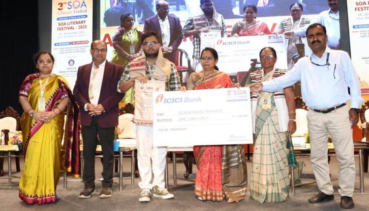 ସମାରୋହର ଦ୍ୱିତୀୟ ଦିନ ଓଡ଼ିଶାର ମୁଖ୍ୟମନ୍ତ୍ରୀ ଶ୍ରୀ ମୋହନ ଚରଣ ମାଝୀ ମୁଖ୍ୟ ଅତିଥି ଭାବେ ଯୋଗ ଦେବାର କାର୍ଯ୍ୟକ୍ରମ ଥିବା ବେଳେ ଜରୁରୀ କାର୍ଯ୍ୟବଶତଃ ସେ ଯୋଗ ଦେଇ ପାରିନଥିଲେ । ମୁଖ୍ୟମନ୍ତ୍ରୀ ଏହି ସାହିତ୍ୟ ଉତ୍ସବର ଆୟୋଜନ କରିଥିବାରୁ ସୋଆ ବିଶ୍ୱବିଦ୍ୟାଳୟକୁ ଏକ ବାର୍ତା ମାଧ୍ୟମରେ ଶୁଭେଚ୍ଛା ଜଣାଇଥିଲେ । ନିଜ ବାର୍ତାରେ ମୁଖ୍ୟମନ୍ତ୍ରୀ କହିଥିଲେ ଯେ ସଂସ୍କୃତିକୁ ରୁଦ୍ଧିମନ୍ତ କରିବାରେ ଏବଂ ଗୋଟିଏ ଜାତିର ପରିଚୟ ସୃଷ୍ଟି କରିବାରେ ଭାଷାର ଯେତିକି ଭୂମିକା ରହିଛି, ଠିକ ସେମିତି ଭୂମିକା ରହିଛି ଲେଖକଙ୍କର । ସାହିତ୍ୟ ଉତ୍ସବର ପ୍ରସଙ୍ଗ ‘ସଂସ୍କୃତି, ସୃଜନଶୀଳତା ଏବଂ କୃତ୍ରିମ ବୁଦ୍ଧିମତା’କୁ ସମୟ ଉପଯୋଗୀ ବୋଲି କହିବା ସହ ଏହି ଉତ୍ସବରେ ଯୋଗ ଦେଇଥିବା ଲେଖକ, କବି ଓ ବକ୍ତାମାନଙ୍କୁ ମୁଖ୍ୟମନ୍ତ୍ରୀ ଅଭିନନ୍ଦନ ଜଣାଇଥିଲେ । ସୋଆର ଏଭଳି ପଦକ୍ଷେପ ବାସ୍ତବିକ ପ୍ରଶଂସନୀୟ ବୋଲି ଶ୍ରୀ ମାଝୀ କହିଥିଲେ । ଚଳିତ ବର୍ଷ ଆରମ୍ଭ କରାଯାଇଥିବା ସୋଆ ଯୁବ ସାହିତ୍ୟ ପୁରସ୍କାର ଯୁବ ସାହିତ୍ୟିକ ଶ୍ରୀ ସୂର୍ଯ୍ୟସ୍ନାତ ତ୍ରିପାଠୀଙ୍କୁ ତାଙ୍କ କ୍ଷୁଦ୍ର ଗଳ୍ପ ସଂକଳନ ‘ଠିଆ ପୁଚି ନାରଙ୍ଗ’ ନିମନ୍ତେ ପ୍ରଦାନ କରାଯାଇଥିଲା । ଶିକ୍ଷା ଓ ଅନୁସନ୍ଧାନ (ସୋଆ)ର ଉପସଭାପତି ଶ୍ରୀମତି ଶାଶ୍ୱତୀ ଦାସ ଶ୍ରୀ ତ୍ରିପାଠୀଙ୍କୁ ଏହି ସମ୍ମାନ ପ୍ରଦାନ କରିଥିଲେ । ଶ୍ରୀ ତ୍ରିପାଠୀଙ୍କୁ ଏକ ରୌପ୍ୟ ଫଳକ, ମାନପତ୍ର, ଉତରୀୟ ଏବଂ ୧ ଲକ୍ଷ ଟଙ୍କାର ପୁରସ୍କାର ରାଶି ପ୍ରଦାନ କରାଯାଇଥିଲା । ସମ୍ମାନ ଗ୍ରହଣ କରିବା ଅବସରରେ ନିଜ ଭାଷଣରେ ଶ୍ରୀ ତ୍ରିପାଠୀ କହିଥିଲେ ଯେ ଆମେ ସମସ୍ତେ ଅସହିଷ୍ଣୁତା, ଆତ୍ମଗର୍ବ ଓ ଆତ୍ମମୁଗ୍ଧତାର ଗୋଲକଧନ୍ଦା ଭିତରୁ ବାହାରିବାର ଆବଶ୍ୟକତା ରହିଛି । ସାହିତ୍ୟ ଏବଂ ଶିକ୍ଷା ହିଁ ସମାଜକୁ ସୁଦୃଢ଼ କରିପାରିବ ବୋଲି ସେ କହିଥିଲେ । ଦୁଇ ଦିନିଆ ସାହିତ୍ୟ ଉତ୍ସବର ମୁଖ୍ୟ ପ୍ରସଙ୍ଗ ଏଆଇ ଅର୍ଥାତ୍ କୃତ୍ରିମ ବୁଦ୍ଧିମତା ଉପରେ ପର୍ଯ୍ୟବେସିତ ହୋଇଥିବା ବେଳେ ଶ୍ରୀ ତ୍ରିପାଠୀ କହିଥିଲେ ଯେ ଆମ ମଣିଷମାନଙ୍କର ହୃଦୟ ଏବଂ ଭାବାବେଗ ରହିଛି । ତେଣୁ ଏଆଇ ଆମକୁ କବଳିତ କରିପାରିବ ନାହିଁ । ନିଜ ଅଭିଭାଷଣରେ ସୋଆ ଉପସଭାପତି ଶ୍ରୀମତି ଶାଶ୍ୱତୀ ଦାସ କହିଥିଲେ ଯେ ସାହିତ୍ୟ ଏବଂ ସଂସ୍କୃତିକୁ ଅଣଦେଖା କରି କୌଣସି ସମାଜ ଅଗ୍ରଗତି କରିପାରିବ ନାହିଁ । ଯୁବପିଢ଼ିଙ୍କ ମଧ୍ୟରେ ସାହିତ୍ୟ ପ୍ରତି ଆଗ୍ରହକୁ ବୃଦ୍ଧି କରିବା ହିଁ ଏଭଳି ଉତ୍ସବ ଆୟୋଜନର ମୁଖ୍ୟ ଉଦ୍ଦେଶ୍ୟ ବୋଲି ସେ କହିଥିଲେ ।